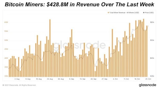 Over the last week, bitcoin miners around the world have earned an impressive $428.8 million (6,873.72 ₿) in revenue. (Dylan Leclair)